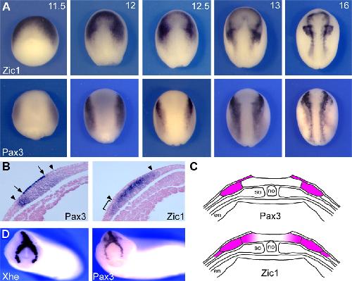 Expression of Pax3 and Zic1 at the NPB. (A) Developmental expression of Pax3 and Zic1 at the NPB in stage-matched embryos (the stages are indicated in the top right corner). Dorsal views, anterior to top. (B) Transverse section through neurula stage embryos illustrating the relative position of Pax3 and Zic1 in the deeper layer of the ectoderm (arrowheads). Pax3 is also detected in the superficial layer of the ectoderm (arrows), and Zic1 expression domain expands more laterally (bracket) than Pax3. (C) Schematic representation of cross-sections through neurula stage embryo showing the domain of expression of the Pax3 and Zic1 (purple). (D) Xhe and Pax3 are coexpressed in the HG at the tailbud stage. Frontal views. |