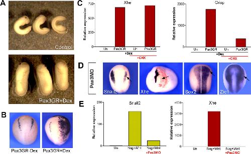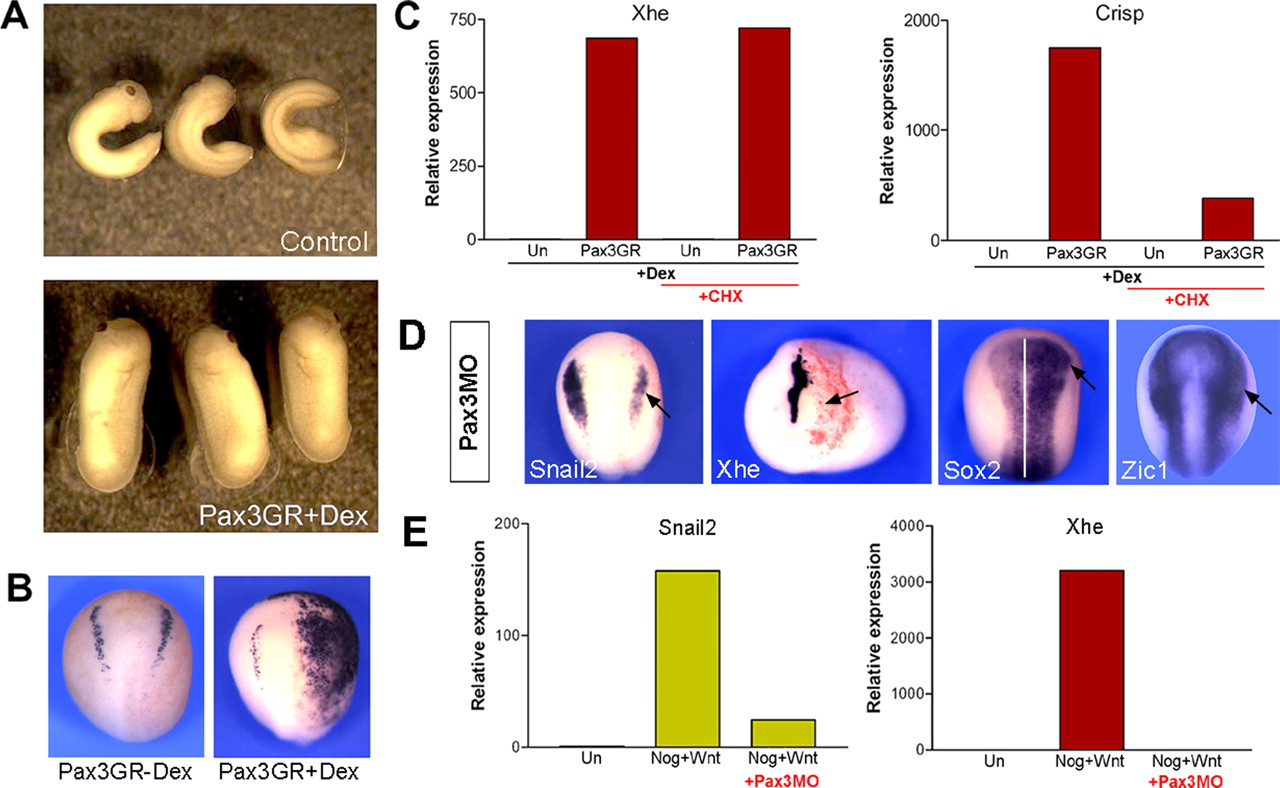 Pax3 is sufficient and required to promote HG fate. (A) Embryos injected with Pax3GR and treated with dexamethasone at the gastrula stage hatch several hours earlier than their uninjected siblings. (B) Stage 17 embryo that received unilateral injection of Pax3GR at the two-cell stage and treated with dexamethasone (+Dex) exhibit a strong ectopic expression of Xhe on the injected side (right side), whereas sibling embryos cultured in the absence of dexamethasone (âDex) are unaffected. Dorsal views, anterior to top. (C) In animal explants, Pax3GR strongly induces Xhe and Crisp expression 4 h after dexamethasone treatment (+Dex). Pax3-mediated induction of Xhe occurs independently of protein synthesis (+CHX). Another HG-specific gene, Crisp, is significantly reduced in the absence of protein synthesis. (D) Embryos injected with Pax3 morpholino (Pax3MO) exhibit a strong reduction of Snail2 and Xhe expression at the neurula and tailbud stages, respectively (arrows). Sox2 and Zic1 expression were expanded in Pax3-depleted embryos (arrows). Embryos hybridized with Snail2, Sox2, and Zic1 are viewed from the dorsal side, anterior to top. For Xhe staining, anterior view is shown. In all cases, the injected side is indicated by an arrow. (E) Noggin+Wnt activates expression of Snail2 and Xhe in animal explants, an activity that is inhibited by coinjection of Pax3MO. |