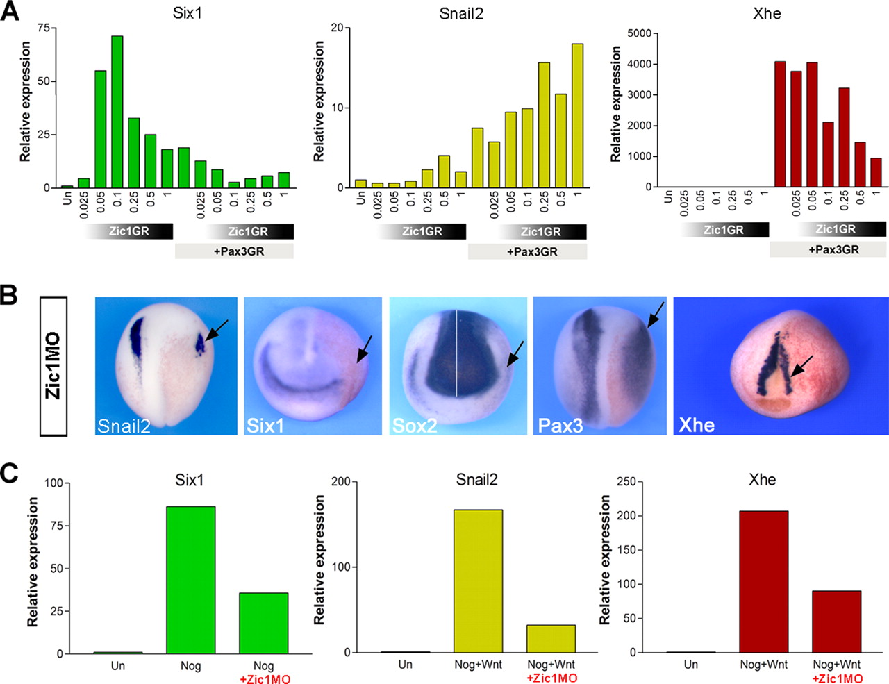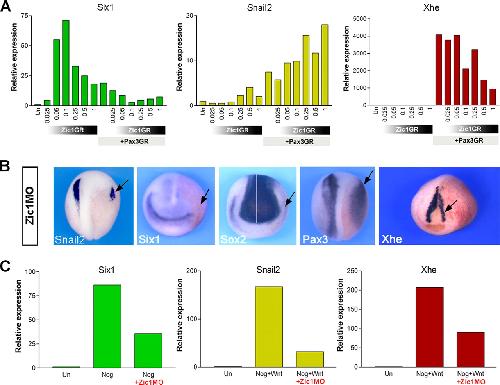 Zic1 promotes the expression of Six1 an activity repressed by Pax3. (A) In animal explants, Zic1GR is sufficient to activate Six1 expression as determined by real-time RT-PCR. Pax3GR strongly represses Zic1-mediated Six1 induction to promote NC (Snail2) and HG (Xhe) fates. The concentrations of Zic1GR mRNA injected are in nanograms. A single dose of Pax3GR mRNA (0.25 ng) was coinjected as indicated. (B) Embryos injected with Zic1 morpholino (Zic1MO) exhibit a strong reduction of Snail2 and Six1 (arrows). The neural plate expression of Sox2 is expanded, whereas Sox2 PE expression domain is reduced (arrow). In these embryos lacking Zic1 function, Xhe expression is altered (arrow), presumably as a consequence of reduced Pax3 expression (arrow). Embryos are viewed from the dorsal side, anterior to top (Snail2 and Pax3). In Six1, Sox2, and Xhe staining, anterior views are shown, dorsal to top. The injected side is indicated by an arrow. (C) Noggin-mediated induction of Six1 is inhibited in the absence of Zic1 function (+Zic1MO). Noggin+Wnt activates expression of Snail2 and Xhe in animal explants, an activity that is inhibited by coinjection of Zic1MO. |