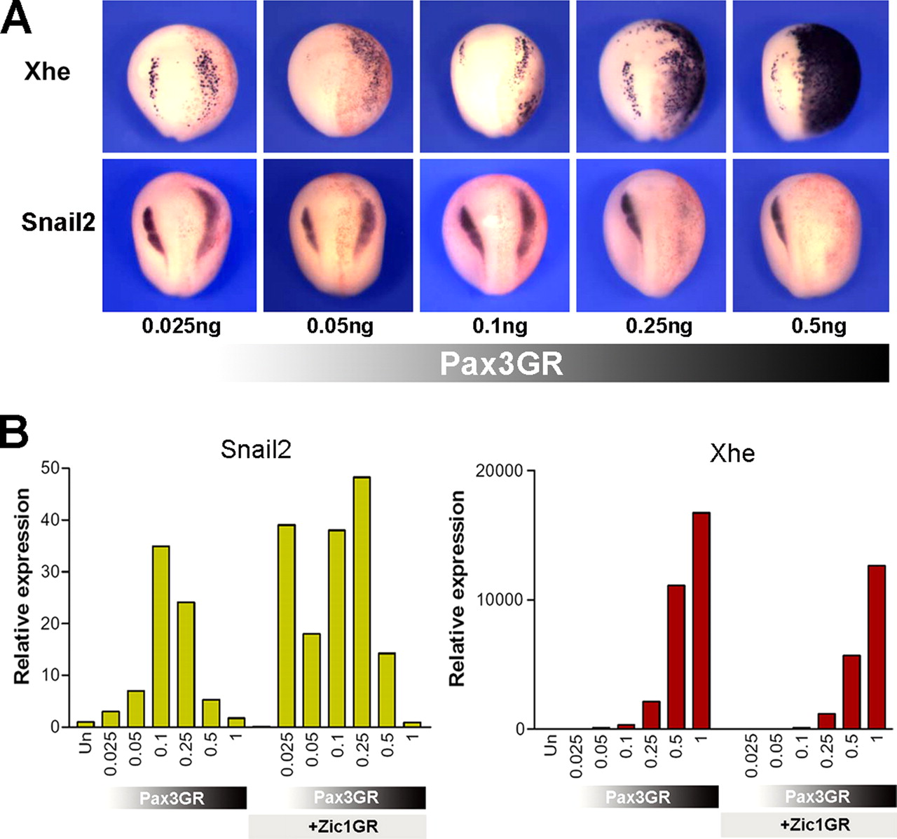 Distinct thresholds of Pax3 activity regulate HG and NC fates. (A) Embryos injected with increasing amounts of Pax3GR mRNA in one blastomere at the two-cell stage and treated with dexamethasone at the gastrula stage were analyzed by whole-mount in situ hybridization for Xhe and Snail2 expression at stage 17. Although Snail2 is expanded laterally and anteriorly by lower doses of Pax3GR, Snail2 is repressed for higher doses of Pax3GR. Ectopic expression of Xhe is proportional to the amount of Pax3GR mRNA injected. Dorsal views, anterior to top. In all panels, the injected side is on the right. (B) In animal explants, the induction of Snail2 and Xhe as determined by real-time RT-PCR depends on different amounts of injected Pax3GR. Zic1GR strongly synergizes with Pax3 to induce Snail2. The concentrations of Pax3GR mRNA injected are in nanograms. A single dose of Zic1GR mRNA (0.25 ng) was coinjected as indicated. |
