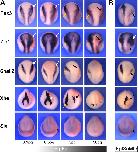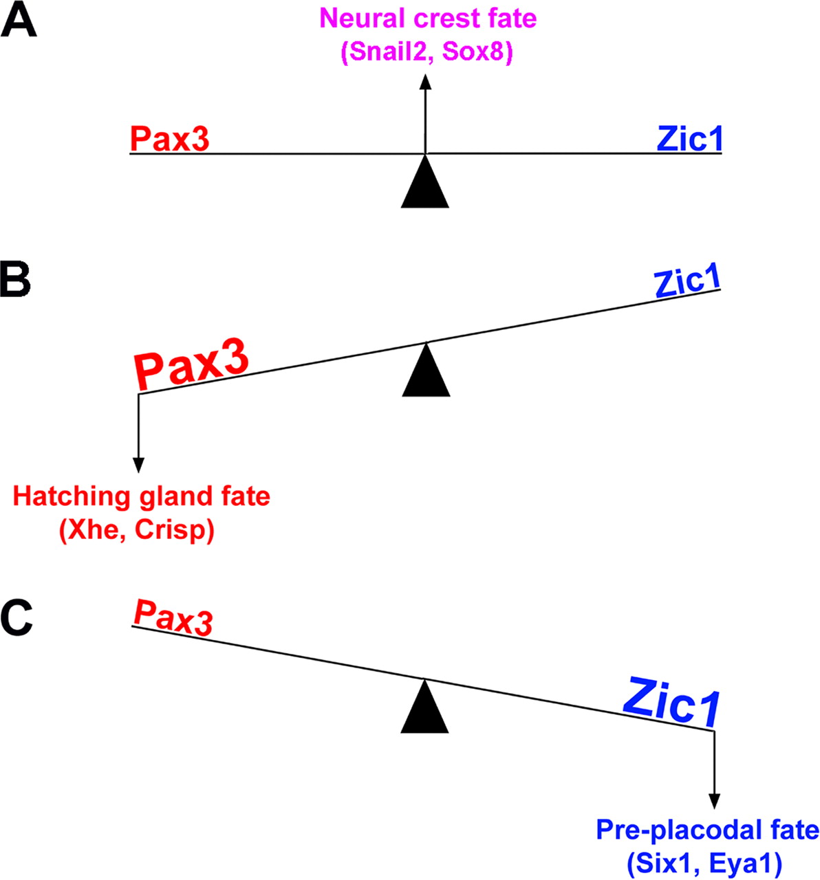 Model for the specification of NPB cells. In response to Bmp, Wnt, and Fgf signaling, the transcription factors Pax3 and Zic1 are activated at the NPB. The activity of these two factors regulates the specification of three NPB cell populations. When Pax3 and Zic1 reach an appropriate balance, NC is induced (A). Variations in the relative activity of these two transcriptional regulators at the NPB can disrupt this balance, either toward Pax3 to promote HG formation (B) or toward Zic1 to promote PE fate (C). |