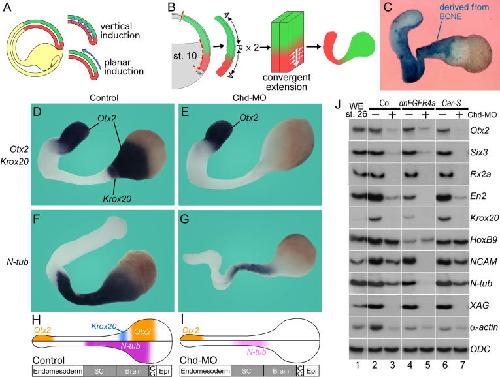 Figure 6. Anterior Neural Induction in Keller Explants Requires Chd(A) Proposed vertical and planar signals in neural induction (following Ruiz i Altaba 1993).(B) Diagram of Keller explant preparation and subsequent elongation of the endomesoderm by convergent extension (Keller 1991).(C) The neural and mesodermal regions of Keller explants contain descendants of BCNE cells (in blue) marked by blastomere injection at the 64-cell stage.(D) Expression of Otx2 and Krox20 in Keller explants (n = 7).(E) Injection of 17 ng Chd-MO completely blocked Otx2 and Krox20 expression in neural regions, while expression of Otx2 in anterior endoderm was not affected (n = 10).(F) The differentiated neuron marker N-tubulin is expressed in Keller explants (n = 8).(G) Partial inhibition of N-tubulin by injection of Chd-MO (n = 7).(H and I) Summary of the effects of Chd-MO in Keller explants. Abbreviations: SC, spinal cord; CG, cement gland; Epi, epidermis.(J) RT-PCR analyses of the effect of Chd-MO in Keller explants; samples injected with (plus) or without (minus) Chd-MO are indicated. Lane 1, whole embryos; lanes 2â7, Keller sandwiches. Note that expression of the neural markers NCAM and N-tubulin in Keller sandwiches was abolished by co-injection with 200 pg of dnFGF receptor 4a (dnFGF4a) mRNA and 17 ng of Chd-MO (lane 5). Injection with 600 pg of CerS mRNA, which eliminates mesoderm but not BCNE formation, does not affect neural induction in this assay (lane 6). |