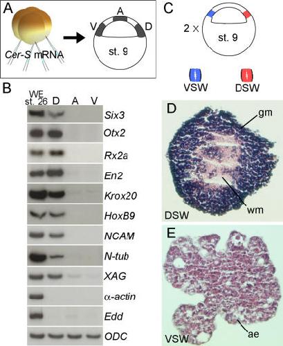 Figure 3. The Blastula Dorsal Animal Cap Is Specified to Form CNS(A) Experimental diagram showing embryos injected with CerS mRNA from which three regions of the animal cap were dissected at blastula, cultured until stage 26, and processed for RT-PCR. The size of the explants was 0.3 mm by 0.3 mm in these samples. Abbreviations: A, animal pole; D, dorsal region; V, ventral animal cap.(B) RT-PCR analysis of animal cap fragments; note that anterior brain markers were expressed in the dorsal fragments in the absence of mesoderm (α-actin) and endoderm (endodermin, Edd) differentiation. Abbreviations: A, animal pole; D, dorsal region; V, ventral animal cap.(C) Experimental diagram of the small animal cap sandwich experiments; these embryos were not injected with CerS. In this case, the size of the explants was 0.15 mm by 0.15 mm leaving a 0.15-mm gap from the floor of the blastocoel to avoid contamination from mesoderm-forming cells. Fragments from two explants were sandwiched together (explants are too small to heal by curling up) and cultured in 1à Steinberg's solution until stage 40. Abbreviations: VSW, ventral sandwich; DSW, dorsal sandwich.(D) Histological section of dorsal animal cap explant (dorsal sandwich). These sandwiches differentiated into histotypic forebrain tissue including white and gray matter (4/17). Abbrevations: DSW, dorsal sandwich; gm, gray matter; wm, white matter.(E) Histological section of a ventral animal cap sandwich. All sandwiches differentiated into atypical epidermis (n = 20). Abbreviations: ae, atypical epidermis; VSW, ventral sandwich. |