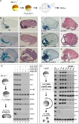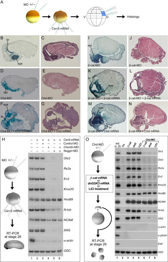 Figure 5. The CNS of Mesodermless Embryos Derives from BCNE Cells and Requires Chd, Nog, and β-Catenin(A) Experimental design. Embryos in which mesoderm induction was inhibited (by injection of 600 pg of CerS mRNA into the vegetal pole) were sectioned at stage 38 and stained with hematoxylin-eosin or for microinjected BDA lineage tracer marking the BCNE region.(B and C) Embryos injected with CerS mRNA alone (n = 40). Abbreviation: br, brain.(D and E) Embryos injected with 17 ng of Chd-MO in addition to CerS (n = 21). Abbreviation: epi, epidermis.(F and G) Coinjection of 17 ng of Chd-MO and CerS, followed by 100 pg of Chd mRNA together with the lineage tracer (n = 19). Abbreviation: br, brain.(H) Expression of anterior CNS markers in mesodermless embryos requires Chd and Nog. RT-PCR analysis of CerS mRNAâinjected embryos at tailbud stage 26. Markers of anterior brain (Otx2), eye (Rx2a), midhindbrain boundary (En2), hindbrain (Krox20), and cement gland (XAG) were inhibited by injection of Chd-MO, Nog-MO, or both. A pan-neural marker (NCAM) and a neuronal marker (N-tubulin) were partially inhibited, and the posterior neural marker HoxB9 was not affected. α-actin serves as a mesoderm marker to show that CerS blocked mesoderm in these embryos and ODC as mRNA loading control. The effects of the Nog-MO described here can be rescued by full-length Nog mRNA lacking the 5â² leader sequence targeted by the antisense morpholino (data not shown).(I and J) β-cat-MO (13.6 ng) together with CerS mRNA (n = 15). Abbreviation: epi, epidermis.(K and L) Rescue of β-cat-MO by 800 pg of β-catenin mRNA. Abbreviation: br, brain.(M and N) Rescue of the β-cat-MO phenotype by 100 pg of Chd mRNA (n = 8).(O) Chd is required for the anterior neural induction caused by β-Catenin. Neural and cement gland markers were induced in animal cap explants by activation of β-Catenin signal by the injection of 600 pg β-catenin mRNA, dnGSK3 mRNA, or LiCl treatment (lanes 3â5). Markers of anterior brain (Six3, Otx2), eye (Rx2a), midhindbrain boundary (En2), hindbrain (Krox20), and cement gland (XAG) were inhibited by Chd-MO (lanes 6â8). Although inhibition was not detected for the posterior neural marker HoxB9 and the pan-neural marker NCAM, the neuronal marker N-tubulin was inhibited. α-actin and α-globin are dorsal and ventral mesoderm markers, respectively, used to show the absence of mesoderm formation, and ODC serves as loading control. |