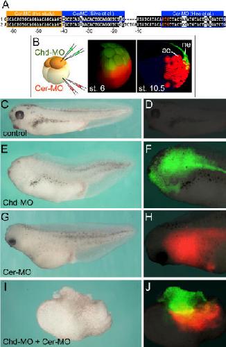 Figure 7. A Double-Assurance Mechanism in Xenopus Neural Induction That Requires Chordin and Cerberus(A) A new Cer-MO is complementary to both Cer pseudoalleles, while two MOs reported by other authors (Hino et al. 2003; Silva et al. 2003) match only one allele, having three or four mismatches, respectively, with the other allele. The Cer-MO used in the present study inhibits head formation in intact embryos (data not shown), while the other two do not (Hino et al. 2003; Silva et al. 2003).(B) Experimental procedure and cell lineages at 32-cell and early gastrula (stage 10.5) for dorsal-animal (FDA, green) and dorsal-vegetal (TRDA, red) blastomeres microinjected at the 8-cell stage.(C and D) Uninjected embryos.(E and F) Dorsal-animal injection with 8.5 ng of Chd-MO alone partially inhibited head formation; green fluorescence was seen in anterior CNS.(G and H) Dorsal-vegetal injection with 17 ng of Cer-MO also inhibited brain formation partially; red fluorescence may be seen in anterior endomesoderm.(I and J) Injection with 8.5 ng Chd-MO dorsal-animally and 17 ng Cer-MO dorsal-vegetally blocked brain formation, but not spinal cord and somites (histological sections not shown). |