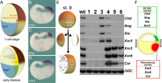 Figure 1. Two Signaling Centers Coexist in the Xenopus Blastula(A) Diagram of early events between 1-cell stage and early blastula.(B–D) Expression of Chd, Nog, and Xnr3 transcripts just after midblastula transition (7 h postfertilization). Embryos were hybridized as whole mounts, stored in methanol for 1 mo at room temperature to improve contrast, and sectioned with a razor blade.(E) RT-PCR analysis of gene markers at midblastula, early stage 9. Six samples were prepared by dissections of blastula regions as shown in the diagram.(F) Summary of gene expression at blastula. The BCNE center expresses Chd, Nog, Siamois, and Xnr3, while the Nieuwkoop center expresses Xnr2, Xnr6, and Cer. |