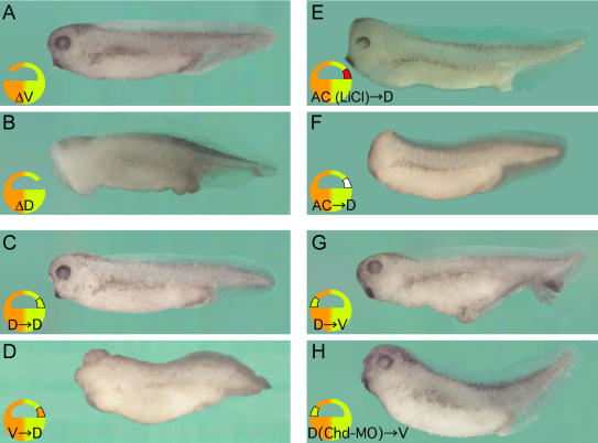 Figure 4. The Dorsal Animal Cap Is Required for Brain Formation(A) Ventral animal cap deletion (ΔV) produces a normal embryo.(B–F) Dorsal animal cap deletion (ΔD) results in loss of anterior brain structure. The headless phenotype of dorsal animal cap deletions was rescued by dorsal animal cap grafts (C) and animal pole grafts obtained from LiCl-treated embryos (E), but not by ventral animal cap transplants (D) or animal pole transplants (F). The average dorso-anterior indices (DAI) were 4.89 ([A] n = 28), 3.52 ([B] n = 25), 4.90 ([C] n = 10), 3.63 ([D] n = 19), 4.90 ([E] n = 12), and 3.50 ([F] n = 10).(G) Transplantation of the dorsal animal cap into the ventral animal cap region of a host embryo induced weak secondary axes (65.4%, n = 26). The embryo shown here was one of the strongest axes obtained.(H) Activity of BCNE transplanted ventrally was blocked by Chd-MO (n = 15). |