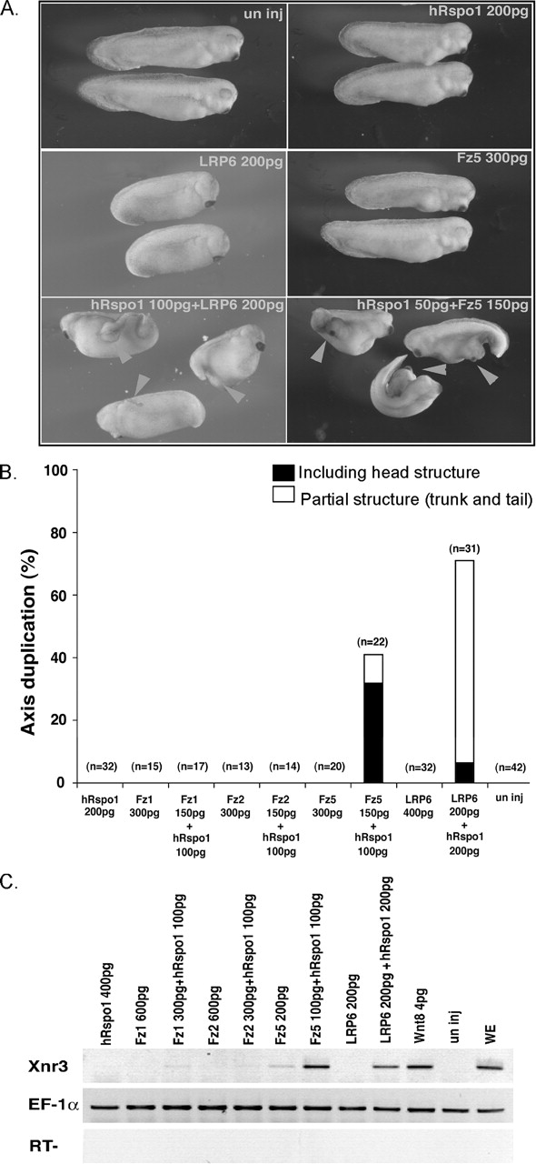 hRspo1 induces axis duplication and Xnr3 expression in the presence of LRP6 or Frizzled5 in Xenopus. A, hRspo1 induces axis duplication when co-injected with LRP6 or Frizzled5. mRNA was injected into the ventral marginal two cells at the 4-8-cell stage. The arrowhead indicates the location of the secondary axis. Note the complete axis duplication in the case of hRspo1 plus Frizzled5. B, summary of data from co-injection experiments. The white bar indicates the percentage of injected embryos that had trunk-tail type of secondary structures. The black bar indicates the percentage of injected embryos that had the secondary head structures. n, number of embryos injected/examined. un inj indicates not injected. C, Xnr3 was induced synergistically in the animal caps by co-injection of hRspo1 and LRP6 or Frizzled5. mRNA was injected into the animal pole of two-cell stage embryos, and the animal caps were dissected at stage 9.5 and cultured until stage 10.5 for RT-PCR analysis. PCR of samples without reverse transcription (RT-) was used as negative control showing no contamination of genomic DNA. The whole embryo (WE) was used as a positive control for RT-PCR. RT-PCR of EF-1α was used as a loading control.