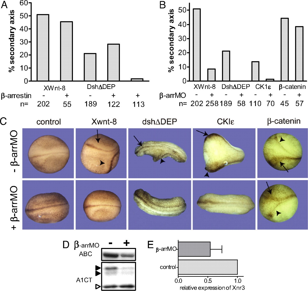 Fig. 5. β-Arrestin is not sufficient but necessary for Wnt/β-catenin signaling in vivo. (A) Percentage of secondary axis induction in Xenopus embryos injected with XWnt-8, DshδDEP, and β-arrestin RNA. n, no. of analyzed embryos per condition. (B) Effect of β-arrestin morpholino (β-arrMO) treatment on XWnt-8-, DshδDEP-, CK1ε-, and β-catenin-induced axis duplication; n, no. of analyzed embryos per condition. (C) Representative photographs of embryos. Secondary axis formation (arrowheads) is best seen by the appearance of a secondary neural tube in neurula (XWnt-8, β-catenin), tailbud (CK1ε), and tadpole stages (DshδDEP). Arrows indicate the endogenous axes. (D) Immunoblotting of Xenopus lysates analyzed for β-catenin dephosphorylation (ABC) and β-arrestin levels (A1CT). Filled arrowheads indicate Xenopus β-arrestin signal. Open arrowhead indicates an unspecific band serving as loading control. Gene expression (Xnr3) was examined in Xenopus embryos by quantitative RT-PCR. (E) Error bars show mean ± SD.