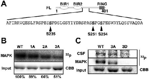 Figure 3. p42MAPK phosphorylates Ser235/251/254 of xEIAP/XLX. (A) Amino acid sequence of xEIAP/XLX residues 219–269. Indicated three Ser residues are changed to either Ala or Asp. (B) Phosphorylation of WT, Ser235Ala single mutant (1A), Ser251/254Ala double mutant (2A), and Ser235/251/254Ala triple mutant (3A). (C) Phosphorylation of WT, 3A, and Ser235/251/254Asp triple mutant (3D). In (B) and (C), MBP-Δ1 variants were incubated with CSF-arrested egg extracts (CSF) or p42MAPK (MAPK) in the presence of [γ-32P] ATP. After separation by SDS-PAGE, incorporated radioactivity was detected by image analyzer. Same amounts of substrates were also stained with Coomassie Brilliant Blue (Input). In (B), the phosphorylation intensities were calculated using NIH ImageJ software and indicated below.