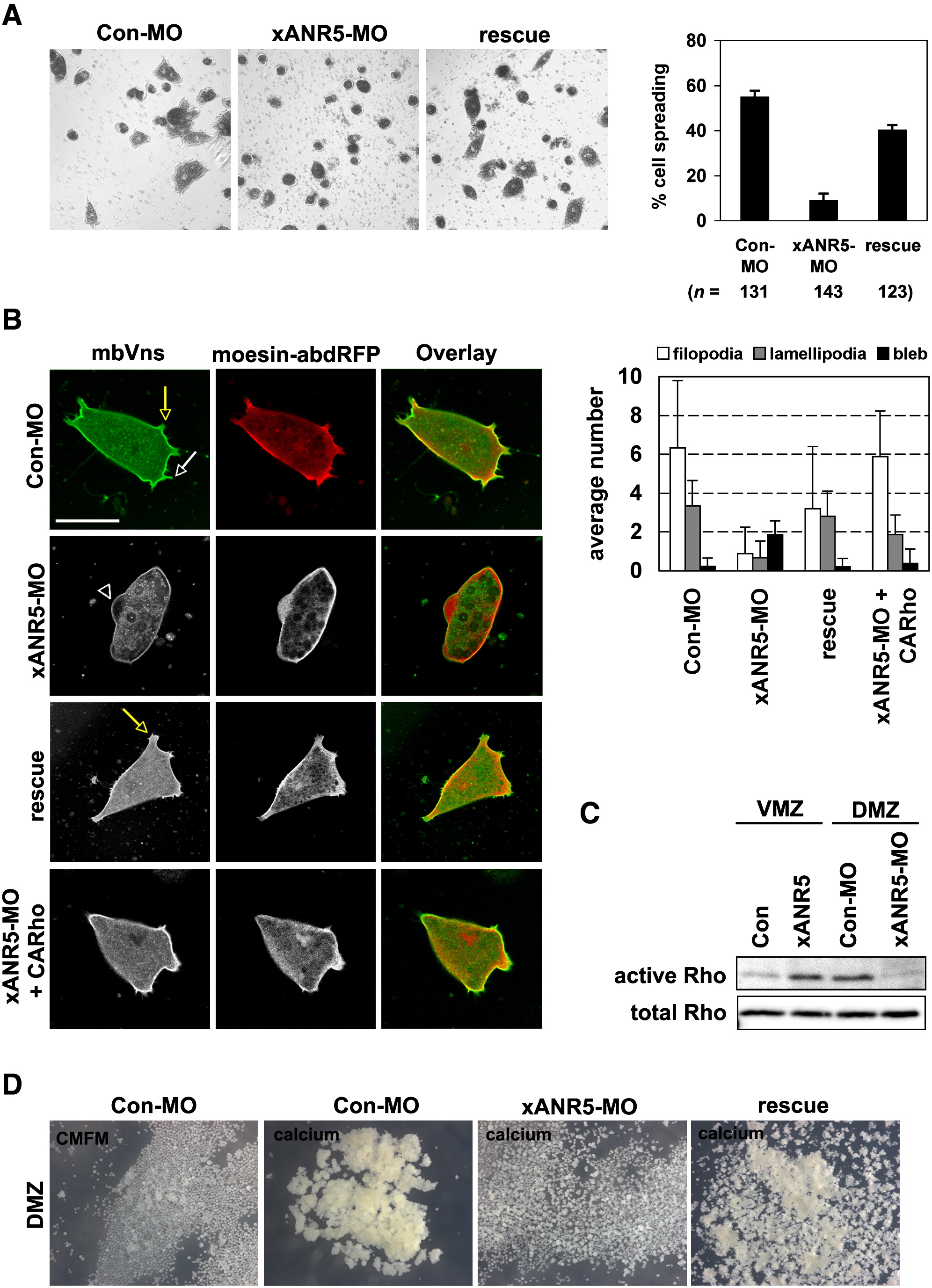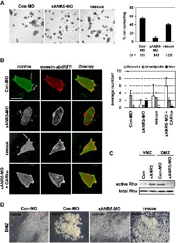 (A and B) The dorsal marginal zone (DMZ) of an embryo that had received a microinjection of MO or mRNA at the 4-cell stage was isolated at stage 10.5 and dissociated in CMFM. Dissociated dorsal cells were plated on a fibronectin-coated glass-bottomed dish, and their spreading on fibronectin was observed after a 1 hr incubation in Steinberg's solution. Unattached cells were removed by gentle washing. Con-MO-injected cells were well spread on the fibronectin and produced fully formed filopodial and lamellipodial protrusions. Membrane blebs were hardly observed in the Con-MO-injected cells. Most of the xANR5-MO-injected cells failed to spread on fibronectin and showed far fewer active protrusions and a higher frequency of membrane blebs than the Con-MO-injected cells. The coinjection of xANR5 or CARho (2.5 pg) could partially and almost completely reverse the effects caused by xANR5-MO, respectively. The white and yellow arrows indicate filopodia and lamellipodia, respectively. Arrowhead indicates a membrane bleb. Error bars indicate standard deviation from three different data. Scale bar represents 50 μm.