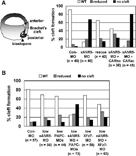 (A) Inhibition of the cleft's extension caused by xANR5-MO was specifically rescued by the coinjection of xANR5 mRNA. CARho (10 pg) could partially rescue the inhibition of the posterior cleft formation caused by xANR5-MO. However, CARac failed to recover the effect of xANR5-MO on cleft formation.