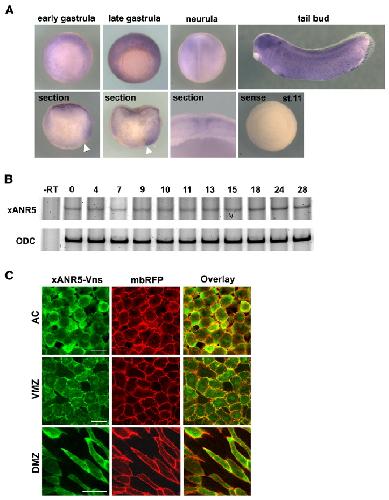 Figure S1. Expression Pattern and Subcellular Localizations of xANR5 through Early Embryogenesis (A and B) Whole-mount in situ hybridization analysis (WISH) and semiquantitative RT-PCR analyses showed ANR5 to be the product of a maternally expressed gene. The expression patterns of xANR5 in the gastrula were almost ubiquitous but dorsally enriched, as seen in the sagittal section. xANR5 RNA was expressed along the neural fold in the neurula, and observed in the eyes, midbrain, and hindbrain, and as dots in the epidermis in later stages. (C) Subcellular localization of xANR5 during early embryogenesis was detected by means of a Vns-tagged construct. A membrane-bound form of RFP was coinjected to detect plasma membrane. xANR5-Vns was localized near the plasma membrane in the AC and VMZ. In the DMZ, xANR5-Vns was localized to the two tips of the spindle-shaped dorsal cells. Scale bars represent 50 mm.