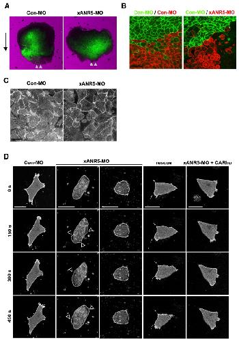 Figure S3. Loss of xANR5 Function Caused a Cell-Adhesion Defect (A) DMZs from embryos that had received either Con-MO or xANR5-MO with Vns mRNA microinjection were observed at stage 14. The Con-MO-injected DMZ underwent convergent extension and showed extensive cell migration. In contrast, the xANR5-MOinjected DMZ remained thick and short, and the MO-introduced cells failed to move. Arrow indicates the direction of mesendoderm migration. Arrowheads indicate the leading edge. (B) Each side of a dorsal cell from an embryo that had received a microinjection of mbVns and mbRFP with MO at the 4-cell stage. The DMZ was isolated at stage 10.5, then cultured on a fibronectin-coated dish. At stage 13, xANR5-MO caused loose coordination among the cells, which were round in shape; in contrast, the cells from Con-MO-injected embryos were well packed. (C) Cell-protrusive morphology in the DMZ from embryos that had received an injection of mbVns and xANR5-MO showed a dramatic loss of protrusions. Some cells appeared to have lost their ability to interact with the cell matrix and had detached from it. Cells from Con-MO-injected embryos developed active cell protrusions. (D) To observe dynamic changes in the protrusive morphology in a single cell, we took a time-lapse movie at 150 s intervals. The cells from Con-MO-injected embryos produced dynamic filopodia and lamellipodia. In contrast, xANR5-MO-introduced cells showed dramatically fewer and smaller active protrusions, which were static on the fibronectin. xANR5-MO-injected cells showed membrane blebs that moved rapidly within the cell membrane. The coinjection of xANR5 or CARho could restore the effect caused by the loss of xANR5 function, and resulted in dynamic protrusions. Arrowheads indicate membrane blebs. Scale bars represent 50 mm.