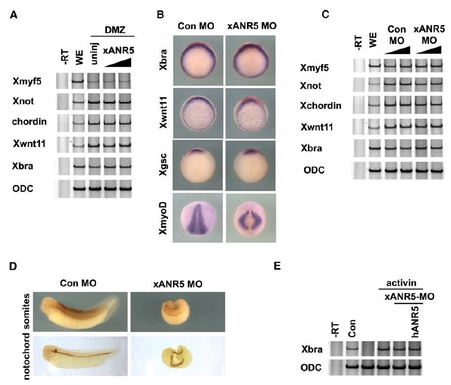 Figure S2. Neither xANR5 mRNA nor xANR5-MO Inhibits Mesodermal Induction and Patterning (A) Ten DMZs overexpressing xANR5 were subjected to RT-PCR analysis. The overexpression of xANR5 did not alter the expressions of the mesodermal markers Xbra, Xwnt11, Xnot, and Xmyf5. The organizer marker chordin was also not changed by xANR5 mRNA microinjection. (BâD) WISH and RT-PCR were carried out to determine whether xANR5-MO injection affected mesodermal induction and patterning. No changes in gene expression, mesodermal induction, or tissue specification as a result of xANR5-MO microinjection were detected. A presumptive head mesodermal marker, Xgsc, and an axial mesodermal marker, XmyoD, were unaffected by xANR5-MO. RT-PCR analysis with mesodermal markers and FGF target genes also showed that xANR5-MO injection did not alter the gene expression patterns during early embryogenesis. (E) Mesodermal induction was tested in activin-injected animal caps. The expression of Xbra, which was induced by activin injection, was unaffected by the coinjection of ANR5-MO or hANR5.