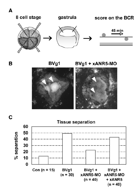 Figure S4. xANR5-MO Inhibits BVg1-Induced Tissue Separation (A) Schematic description of the BCR assay for analyzing tissue separation according to the procedure of Medina et al. [S1]. Embryos received microinjections of mRNA or MOs at the 8-cell stage. The inner cell mass of ACs that were isolated at the gastrula stage was placed on the BCR and then cultured for 45 min. (B) The BVg1-injected inner cell mass separated from the ectoderm, and this was abrogated by the coinjection of xANR5-MO. Arrowheads indicate the inner cell mass of ACs. (C) Statistical data for the in vitro tissue-separation assay.