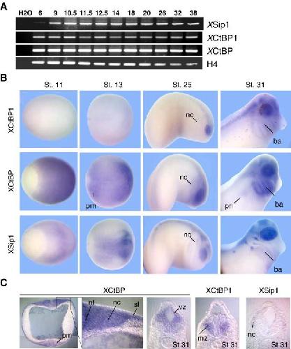 Fig. 5. Comparison of XSip1, XCtBP, and XCtBP1 expression during embryogenesis. (A) RT-PCR analysis of XCtBP, XCtBP1, and XSip1 expression at the indicated embryonic stages. Histone H4 was used as a loading control. Note that both XCtBP and XCtBP1 RNA are detected throughout development, while XSip1 transcripts accumulate at the start of zygotic transcription. (B) Whole-mount in situ hybridization of XCtBP, XCtBP1, and XSip1 at the indicated stages. All embryos are shown with anterior toward the right. (C) XCtBP expression in a horizontal section of a stage 18 embryo with a blow-up showing the restricted XCtBP expression in the deep sensorial layer of the ectoderm. Transversal sections of the neural tube at the level of the hindbrain of stage 31 embryos are shown at the right. Note that XCtBP and XCtBP1 have similar expression patterns during early embryonic development and are co-expressed with XSip1 in the developing neural tissue, XCtBP being expressed earlier and at a higher level than XCtBP1. Later, XCtBP and XCtBP1 have distinct expression domains within the developing neural tube. Abbreviations: mz, marginal zone; vz, ventricular zone; pn, pronephros; ba, branchial arches; nc, neural crest; nt, neural tube; pm, posterior mesoderm; sl, sensorial layer of the ectoderm. St. 11 embryos: dorso-vegetal view, anterior right; St. 13 embryos: dorsal view, anterior right; St. 25 and 31 embryos: lateral view, anterior right. |
