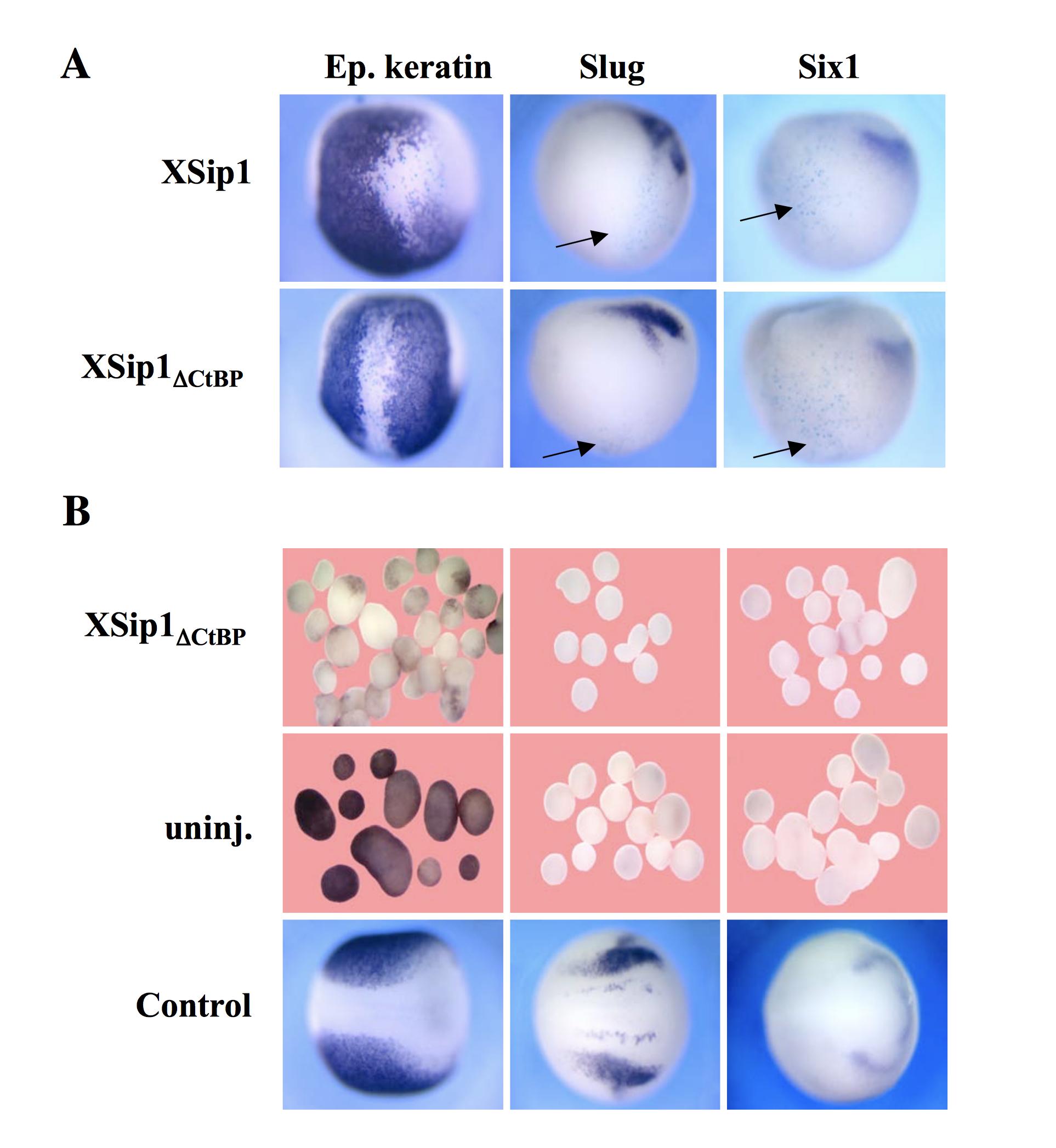 Suplemental Figure2: Overexpression of XSip1 or XSip1δCtBP does not turn on neural crest or placodal markers. Slug expression marks neural crest progenitors. Six1 expression marks cephalic neurogenic placodes. (A) Embryos injected animally with the indicated ARN together with LacZ RNA. Noth that while overexpression of both XSip1 or XSip1δCtBP leads to suppression of epidermis, Slug and Six1 expression are not induced. (B) Animal caps explanted at stage 9 derived from embryos overexpressing XSip1δCtBP or control uninjected embryos. Note that while overexpression of XSip1δCtBP inhibits epidermal keratin expression, Slug and Six1 expression are not induced. |
