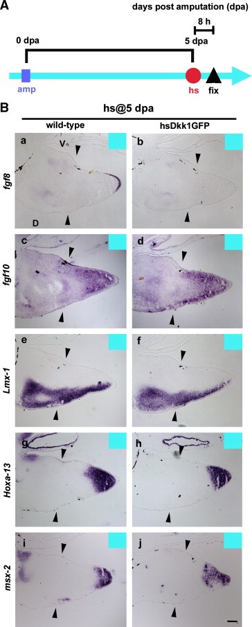 Fig. 5. Dkk1GFP represses fgf-8 expression in the regenerating blastema, but not expression of fgf-10, Lmx-1, Hoxa-13 or msx-2. (A) Experimental scheme. One heat-shock was applied to tadpoles at 5 dpa (blue line). Wild-type and hsDkk1GFP tadpoles were fixed 8 h after the heat-shock. (B) In situ hybridization on sectioned samples of blastemas. Sectioned samples were hybridized with fgf-8 (a and b), fgf-10 (c and d), Lmx-1 (e and f), Hoxa-13 (g and h) or msx-2 (i and j). To guarantee the correct comparisons of the gene expression level, wild-type (a, c, e, g and i) and hsDkk1GFP (b, d, f, h and j) tadpole sections treated exactly the same way. Arrowheads show amputation level (knee level). D, dorsal; V, ventral. Scale bar: 100 μm.
