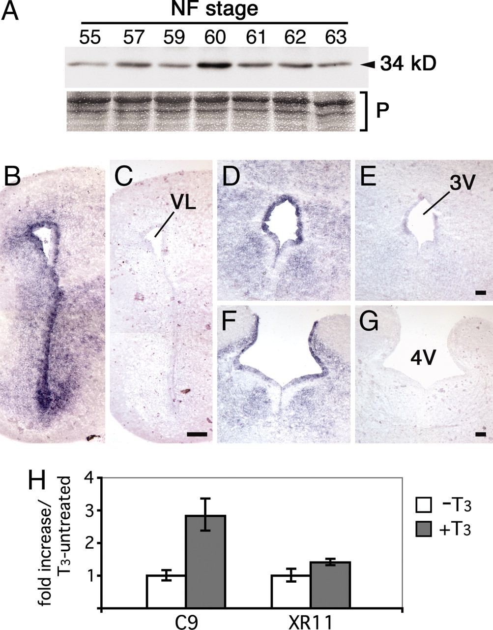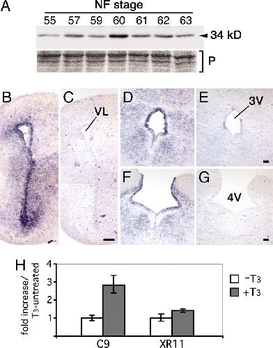 Fig. 1. Caspase-9 mRNA and activated caspase-9 increase in metamorphic tadpole brains. (A) Activation of C9 was monitored by Western blotting on brain extracts of tadpoles at different stages of metamorphosis, by using an active C9 specific antibody. The 34-kDa band, corresponding to conversion of pro-C9 to active C9, as predicted from cleavage sites in the procaspase sequences (17), is seen from stage NF55 (onset of metamorphosis) up to stage NF63 (end of metamorphosis), peaking at stage NF60 (climax of metamorphosis). The immunoblot was repeated by using independent samples. Equal amounts of proteins were loaded per lane and subsequently confirmed by Ponceau-S staining (P). (BâG) Spatial distribution of C9 mRNA in Xenopus brains at stage NF63 with ISH, by using an antisense digoxigenin-labeled probe on coronal sections (B, D, and F). Strong localized expression of C9 mRNA is seen in the ventricular zone of the anterior (B), medial (D), and posterior (F) brain. Control adjacent sections were hybridized with a sense probe (C, E, and G), showing no labeling. ISH was done twice on independent groups of tadpoles showing identical results. VL, 3V, and 4V: lateral, third, and fourth ventricles. (Scale bars: BâG, 50 μm.) (H) Quantitative-PCR analysis of C9 and XR11 expression after T3-treatment of perchlorated tadpoles. Fold inductions were normalized against untreated tadpoles. Statistical analysis for PCR data were done comparing the means of δCT values ± SD, by using Student's t test (n ⥠3): Differences were extremely significant for C9 (P < 0.001) and significant for XR11 (P < 0.05). |