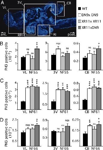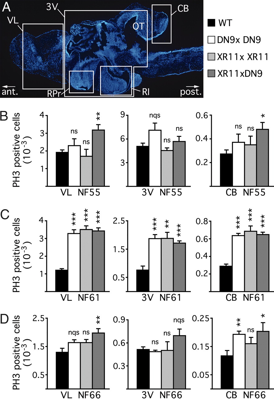 Fig. 2. Cell proliferation increases at metamorphic climax in brains of transgenics overexpressing DN9 and/or XR11. Cell proliferation was followed in Nβt-driven DN9-RFP (DN9xDN9), XR11-GFP (XR11xXR11), and double-transgenic XR11-GFP/DN9-RFP (XR11xDN9) tadpoles by using a PH3-antibody and compared with WT or Nβt-driven RFP and GFP transgenic controls at different stages of metamorphosis. (A) DAPI- labeled sagittal section of a brain showing the three areas analyzed: VL, 3V, and CB. Proliferating cells were counted in the cell layers bordering ventricles for each area. (B) PH3-positive cells were counted at stage NF55 (onset of metamorphosis), around the VL in the anterior brain (VL NF55), the 3V (3V NF55), and the CB (CB NF55). Note that mitosis was enhanced only in VL and CB for XR11xDN9, but overall proliferation at this stage did not differ between transgenics and WT. (C) PH3-positive cells were counted at stage NF61 (climax of metamorphosis), in the same areas as for stage NF55. Note that mitosis was strongly enhanced in all areas for all transgenics compared with WT. (D) PH3-positive cells were counted at stage NF66 (end of metamorphosis), in the same areas as B and C. Note that mitotic numbers only show a slight, but significant, increase in VL for XR11xDN9 and in CB for DN9xDN9 and XR11xDN9. Means ± SEM are given; n > 6 in each group; not significant (ns), P < 0.5; not quite significant (nqs), P < 0.1; ∗, P < 0.05; ∗∗, P < 0.01; ∗∗∗, P < 0.001. RPr, recessus preopticus; RI, recessus infundibuli; OT, optic tectum. |