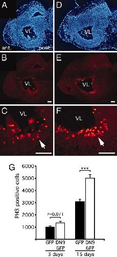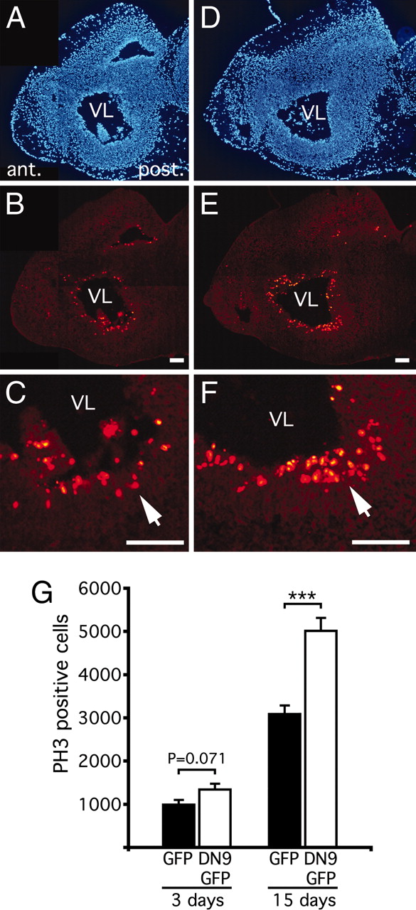 Fig. 3. DN9 expression increases active cell proliferation in the ventricular zone of transfected brain. SGT in brain was carried out at stage NF57 by using CMV-driven DN9-GFP or GFP constructs, and proliferation was compared between DN9 and controls at 3 and 15 days after transfection by using the PH3-antibody. (AâF) Mitotic cells were observed on para-sagittal sections at 15 days after transfection for control (B and magnification, C) and compared with DN9 (E and magnification, F), showing more proliferative cells in DN9-transfected brain. DAPI counterstaining shows the same anterior brain region compared with control (A) and DN9 transfections (D). Note at higher magnification the greater concentration of positive cells for DN9 (arrows) lining the ventricle. (G) PH3-positive cells were counted for the VL in the anterior brain, showing a strong increase in mitosis in brains transfected with DN9 vs. controls. Each experiment was repeated twice, giving similar results. Means ± SEM are given; n > 6 in each group; âââ, P < 0.001. (Scale bars: A-F, 100 μm.) |