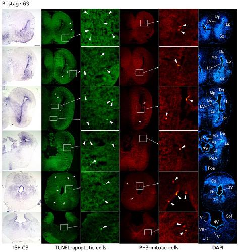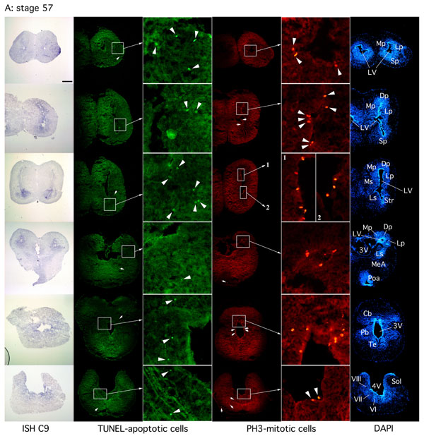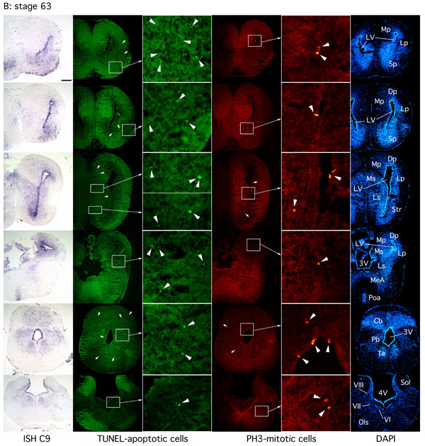 Fig. 5. Correlation between caspase-9 expression, apoptosis and proliferation at the onset and the end of brain metamorphosis. Spatial distribution of C9 mRNA by in situ hybridization (ISH C9), using an antisense digoxigenin-labeled probe on coronal sections, was correlated with distribution of cell death (TUNEL-apoptotic cells) and cell proliferation (PH3-mitotic cells), throughout brains of stage NF57 Xenopus tadpoles (A: onset of metamorphosis) and at stage NF63 (B: end of metamorphosis). DAPI labeling annotated with stereotaxic nomenclature is given for each section from the anterior part of the brain (Upper) to the posterior part of the brain (Lower). Note that at stage NF63 there is a strong localized expression of C9 mRNA in ventricular areas, but also a widespread less-intense expression throughout most of the brain. A similar overall but less intense C9 mRNA brain distribution is found at stage NF57, whereas C9 mRNA expression in the ventricular areas at this stage is much less than at stage NF63. Localization of the majority of TUNEL-positive cells generally maps with the C9 distribution at the two stages observed, whereas proliferation is mainly associated with the ventricular zones. Interestingly, at stage NF57, proliferation is marked in ventricular areas when C9 expression is weak, whereas at stage NF63, proliferation decreases when C9 is strongly expressed in the ventricular areas. (Scale bars, 200 mm for all images, except boxes with magnification.) Sol, solitary tract; Ols, superior olivary; VI, abducens nucleus; VII, motor facial nucleus; VIII, vestibulocochlear nucleus; Te, tegmental nucleus; Pb, parabrachial nucleus; Cb, cerebellum; Poa, anterior preoptic nucleus; MeA, medial amygdala; Ls and Ms, lateral and medial septum; Lp, Mp and Dp : lateral, medial and dorsal pallium; Str, striatum; Sp, subpallium; LV, 3V and 4V : lateral, third and fourth ventricles. |