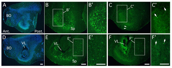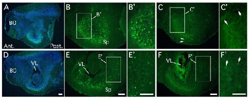 Fig. 6. Transgenic XR11xDN9 tadpoles show decreased neuronal apoptosis in brain. Apoptosis was followed by TUNEL staining at the climax of metamorphosis (stage NF61), in brains of wild type tadpoles (WT; A, B, D, and E) as compared to double transgenics overexpressing both the Bcl2-like protein XR11 and the C9 dominant negative DN9 (XR11xDN9; C and F). Labeling of apoptosis using a fluorescein-linked probe was observed on two different para-sagittal sections in the anterior brain (A and D), counterstained with DAPI to visualize the totality of the cells. Apoptotic labeling was strong in WT tadpoles, particularly in the ventral forebrain (B and E and magnification B' and E'), whereas only a few apoptotic cells (arrows) were observed in these same regions for double transgenics (C and F and magnification C' and F'). Each experiment was repeated twice on independent animals. BO, olfactory bulb; Sp, subpallium. (Scale bars, 100 mm in A-F'). |