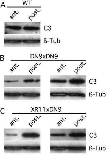 Fig. 7. Caspase-3 activity is decreased in the anterior brain of transgenic animals. Western blot analyses were compared, using a specific antibody against active caspase-3 (C3), on pooled extracts of either anterior or posterior brains of transgenic or WT tadpoles at the end of metamorphosis (stage NF66). Representative Western blots are showed for a WT animal (A), two different DN9xDN9 transgenics (B), and two different double transgenics XR11xDN9 (C), where C3 activity (C3), normalized against b-tubulin (b-tub), has been compared between the anterior (ant.) and the posterior (post.) part of the brain. For the control animals, no difference is seen between the posterior and the anterior part of the brain, whereas for the transgenic animals DN9xDN9 or XR11xDN9, there is less C3 activity in the anterior part of the brain compared to the posterior part. Note that the decrease in C3 activation for the transgenics can be strong (Left) or weak (Right). Immunoblots were repeated from n > 5 independent samples in each group. |
