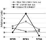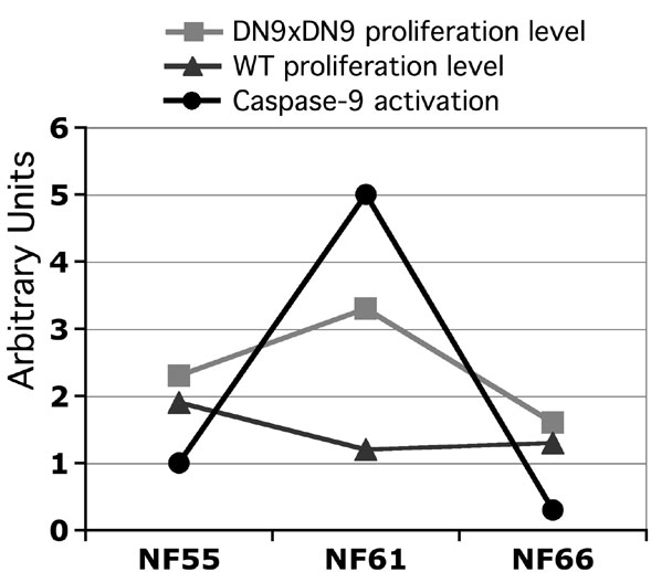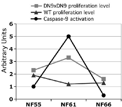 Fig. 9. Schema of comparative levels of caspase-9 activation and proliferation in DN9 transgenic and WT animals during metamorphosis. C9 activation (circles) is taken from Fig. 1. Cell proliferation levels in the lateral ventricle are taken from our mean VL values obtained at stages NF55, NF61, and NF66 for WT (triangles) and DN9xDN9 (squares) animals (Fig. 2). Note that cell proliferation in WT decreases at metamorphic climax, when C9 activity is high. Inversely, when C9 is inactivated by DN9, proliferation peaks at metamorphic climax. All values are given using arbitrary units, to permit comparison of their individual variations during metamorphosis. |