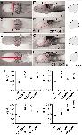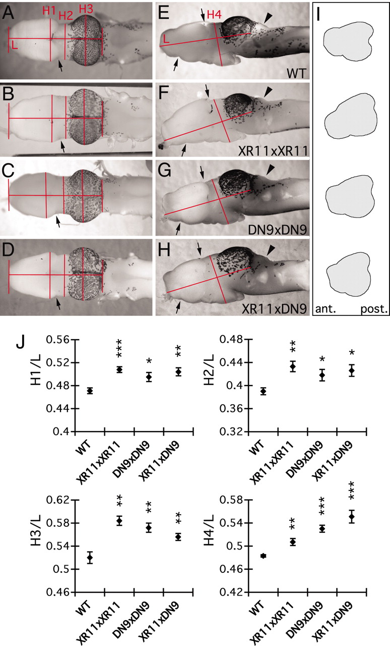 Fig. 4. Overexpression of DN9 and/or XR11 during metamorphosis modifies brain morphology in transgenic animals. (A–H) Representative brains seen in dorsal (A–D) or lateral (E–H) views are shown for WT (A and E), XR11xXR11 (B and F), DN9xDN9 (C and G), and XR11xDN9 (D and H) tadpoles. Note that commissures at the junctions between olfactory bulb or medial brain with the anterior brain (compare arrows) are more marked in control than in transgenics. Note also the larger CB in transgenics vs. WT (compare arrowheads). (I) Schematic representation of the forebrain of WT and each transgenic seen in E, F, G, and H, respectively (lateral views). The form of the forebrain shows a progressive compaction, XR11xXR11 and DN9xDN9 corresponding to an intermediate state and XR11xDN9 to the most marked compaction. (J) Different measurements were done for transgenic and WT brains, width of the forebrain (H1), width of the midbrain (H2 and H4), and width of the optic tectum (H3), and ratios were calculated with respect to brain length from the rostral tip to rear of optic tectum (L). All ratios H/L given for each measure were significantly increased in all transgenics in comparison with WT. Means ± SEM are given; n > 6 in each group; ∗, P < 0.05; ∗∗, P < 0.01; ∗∗∗, P < 0.001. |