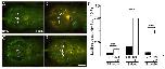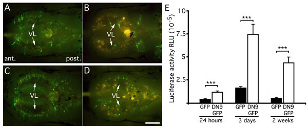 Fig. 8: Transfection with DN9 increases cell survival in brain. Somatic gene transfer (SGT) into the brain of stage NF57 tadpoles was carried out with the CMV-driven DN9-GFP or GFP constructs. Each plasmid was coinjected with the pcDNA3-LUC reporter plasmid, and cell survival was followed either by GFP fluorescence observation or by measuring luciferase activity in brain extracts at different time points. (A-D) In toto observation of GFP expression in brain at 3 days (A and C) and 2 weeks (B and D) posttransfection shows an increased number of cells that express the transgene at these two observed times for DN9 animals (C and D) compared with controls (A and B). (E) Luciferase expression was monitored at 24 h, 3 days, and 2 weeks posttransfection. At all time points, DN9 transfection resulted in a significant increase in luciferase expression compared with controls. Moreover, with respect to the relative ratios (DN9 vs. control) given at the three time points monitored, we showed that they increased 3-, 4.5-, and 8.5 -fold at 24 h, 3 days, and 2 weeks, respectively. Experiment was repeated twice, giving similar results. Means ± SEM are given; n = 10 in each group; ***P < 0.001. (Scale bar, 500 mm in A-D.) |