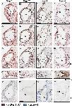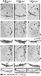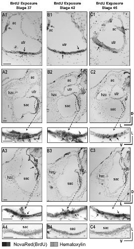 Fig. 3 (Right). Terminal mitosis in the inner ear of stage 47 X. laevis that were transiently exposed to BrdU at stages 37 (A), 42 (B) and 45 (C). Anterior to posterior sections representing the entire inner ear show the presence of BrdU-positive cells (black/dark-grey) with birthdates from earlier stages (S37, A1-A3; S42, B1-B3; S45, C1-C3) in stage 47 otic epithelia. Cells that had undergone terminal mitosis (arrows, dashed circles) are predominantly seen in the central regions of the emerging sensory epithelia of the utricle (A1, B1, C1) and of the sacculus (A2-A3, B2-B3, C2-C3) regardless of stage of BrdU exposure. Images of the saccular region within the dashed circles are shown at higher magnification underneath the corresponding panels. Control sections processed for immunohistochemistry with secondary antibody but without primary (anti-BrdU) antibody and counterstained with hematoxylin are shown in panels (A4, B4, C4) for the saccular epithelium. Hematoxylin counterstain (light grey). Scale bar, 50 μm.