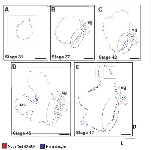Fig. 5 (Right). Schematic diagrams illustrating cell production in sections of the stage 31 (A), 37 (B), 42 (C), 45 (D) and 47 (E) X. laevis inner ear that contain saccular epithelium (dashed circles) and the sensory ganglion (sg). (A) At early stages, BrdU-positive cells (red) are distributed throughout the entire epithelium of the stage 31 otic vesicle. (B-D) At stages 37 (A), 42 (B) and 45 (C), BrdU-positive cells are detected throughout the otic epithelium but appear restricted to specific regions such as the outer boundaries of the emerging saccular sensory epithelium and flanking the protrusions of the emerging horizontal canals (D). (E) In the stage 47 inner ear, BrdU-positive cells are distributed throughout the otic epithelium without a distinct trend toward localization in a particular region. Hematoxylin counterstain (blue). Scale bar, 100 μm.