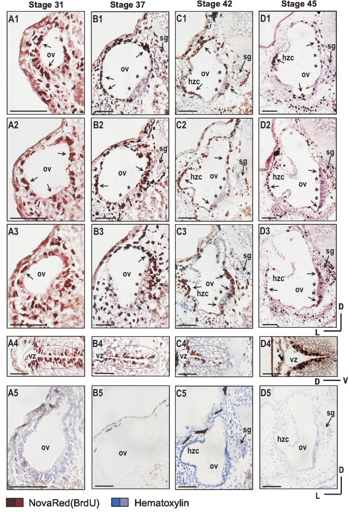 Fig. 1. Cell proliferation in the stage 31 (A), 37 (B), 42 (C) and 45 (D) X. laevis inner ear, three hours after transient exposure to BrdU. Representative anterior to posterior sections (A1-A3; B1-B3; C1-C3; D1-D3) show BrdU-positive cells labelled with anti-BrdU antibody (red/brown; arrows) and counterstained with hematoxylin (blue/violet). (A) At stage 31, BrdU-positive cells are distributed throughout the epithelium of the otic vesicle (A1-A3). (B-D) Few BrdU-positive cells are detected in the emerging saccular epithelium (asterisks), while BrdU-positive cells can be seen flanking these regions in the stage 37 (B1-B3), 42 (C1-C3) and 45 (D1-D3) inner ear. BrdU-positive cells (arrows) can be seen restricted to other regions of the otic epithelium and within the sensory ganglion at stage 42 (C1-C3) and 45 (D1-D3). BrdU-positive cells (dashed circles) are visible in the ventricular zone of the brain in all stages (A4, B4, C4, D4). Control sections processed for immuno- histochemistry with secondary antibody but without primary (anti-BrdU) antibody and counterstained with hematoxylin (blue/violet) are shown in panels A5, C5, D5; panel B5 shows a control section that was not counterstained with hematoxylin. Scale bar, 100 μm.