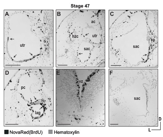 Fig. 2 (Left). Cell proliferation in nascent sensory compartments of the stage 47 X. laevis inner ear, three hours after transient exposure to BrdU. Anterior to posterior sections representing the entire inner ear (A-D) show the presence of BrdU-positive cells (deep black; arrows) in the epithelia of all endorgan compartments. (A) BrdU- positive cells are more prevalent in the ventral regions of the utricle in anterior sections. (B) BrdU-positive cells are distributed throughout the epithelium of the utricle, horizontal canal, sacculus and anterior canal. (C) BrdU incorporation was detected in the saccular sensory epithelium and in the sensory ganglion. (D) BrdU-positive cells are visible in the lagena and posterior canal in posterior sections of the inner ear. (E) BrdU-positive cells were detected in the ventricular zone of the brain. (F) Control section processed for immunohistochemistry with secondary antibody but without primary (anti-BrdU) antibody. Hematoxylin counterstain (grey). Scale bar, 100 μm.