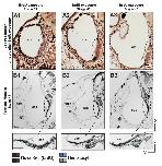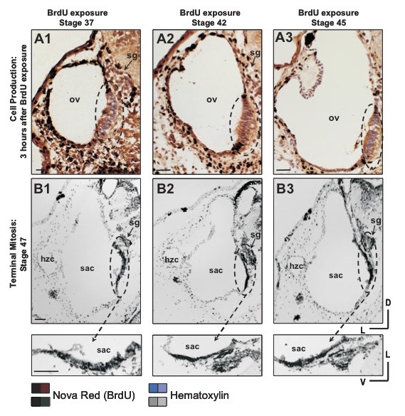Fig. 4 (Left). Comparison of new cell production (A) and terminal mitosis (B) in the saccular region of the X. laevis inner ear. (A) Cell proliferation observed after three hours of development following transient BrdU exposure at stages 37 (A1), 42 (A2) and 45 (A3). BrdU-positive cells (red/brown) flank the emerging saccular epithelium (dashed circles) at all stages. Few BrdU-positive cells are detected within the thickened region of the saccular epithelium. (B) Terminal mitosis observed at stage 47 following BrdU exposure at stage 37 (B1), 42 (B2) and 45 (B3). Images of the saccular region within the dashed circles are shown at higher magnification underneath the corresponding panels. In contrast to Fig. 4A, BrdU-positive cells (black/ dark-grey) with birthdates from earlier stages are prevalent in the thickened central region of the saccular epithelium (dashed circle). Hematoxylin counterstain (A, blue/violet; B, light grey). Scale bar, 50 μm.