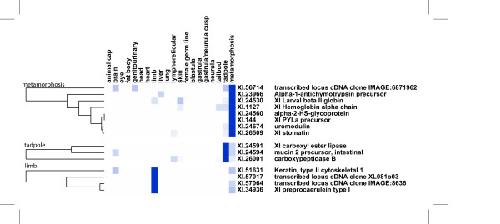 Figure 3. Digital expression profiles of X. tropicalis transcripts differentially expressed at metamorphosis. Each line gives the expression profile of a given transcript represented by a UniGene cluster. The expression is deduced from counting the occurence of ESTs derived from a given cDNA library. The level of expression is colour coded in blue shades, dark blue means evidence for high levels of transcripts and white means no evidence for expression. On the left, clusters of expression profiles are delineated by a vertical bar labelled with the associated characteristic domain of expression. On the right, the cluster name and its annotation (i.e. the corresponding gene product description as deduced from sequence similarity analysis) are given. Each column corresponds to a category of tissue or stage of development: 8 adult tissues and 6 stages of development. Note that a given category may correspond to several cDNA libraries. Here, only clusters for which evidence of differential expression were used to build the matrix of expression. This matrix was analysed by hierarchical clustering on the expression profile dimension using CLUSTER 3.0 as described in the methods section.