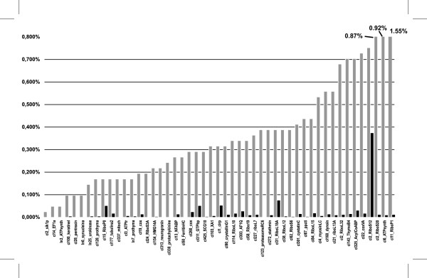 Figure 1. Assessment of normalization effectiveness. Histogram showing the percentage of sequence matching each oligonucleotide used in the procedure of normalization by hybridization. Bars represent percentages of positive clones calculated before (grey bars) and after normalization (black bars). Data before normalization were obtained after partial sequencing of 1,989 cDNAs from xthr and 1,694 cDNAs from xtbs. Note the relatively high abundance of cell-type specific transcript such as gamma crystallin (crystallinG1) or neurogranin (underlined on the figure).