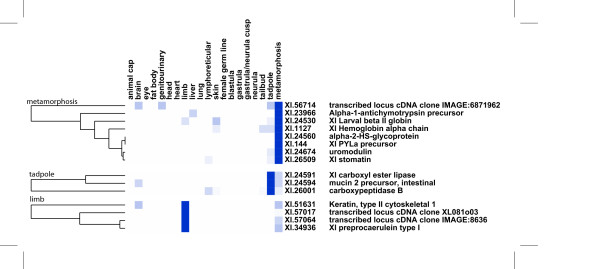 Figure 4. Digital expression profiles of X. laevis transcripts differentially expressed at metamorphosis. Using the same representation as in Fig. 3 three clusters are depicted that are associated with differential expression at metamorphosis (top cluster), tadpole stage (middle) and in the forming limb (down).