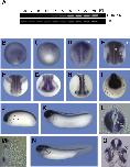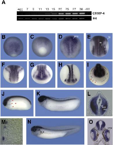 Fig. 2. Expression of Xenopus CRMP-4. (A) Temporal expression of CRMP-4 determined by RT-PCR at various stages of Xenopus development. The ubiquitous marker Histone H4 served as a loading control. (B-O) Xenopus embryos at the indicated stages were analyzed by whole mount in situ hybridization using a digoxigenin- labelled CRMP-4 antisense probe. (B) Stage 11.5 d., (C) stage 11.5, veg., (D) stage 12.5 d., (E) stage 14 d., (F) stage 15 d., (G) stage 15 ant., (H) stage 16 d-ant., (I) stage 19 ant., (J) stage 24, (K) stage 28, (L) transversal section of (K) through the spinal chord, (M) transversal section of (K) showing through the punctuate anterior-