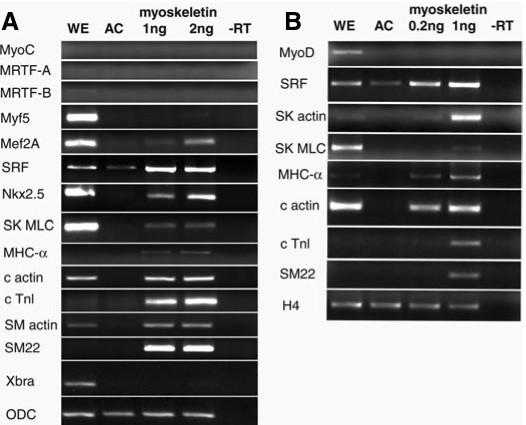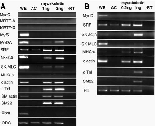 Fig. 5 (Right). MyoS induces muscle genes in animal explants. MyoS RNA was injected into the animal region of 2-cell embryos, animal caps were dissected at blastula, cultured to equivalent stage 12.5 and the expression of various genes was assayed by RT-PCR. In (A), 1 and 2ng mRNA was injected per embryo, in (B) the doses were 0.2 and 1ng. AC, uninjected animal caps; -RT, without reverse transcriptase.