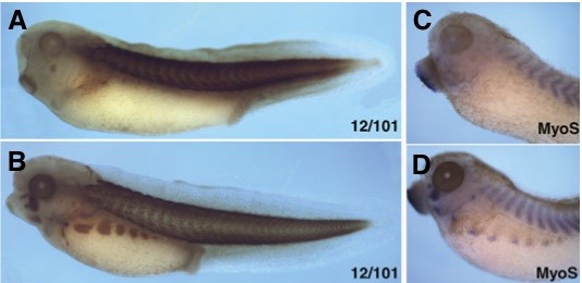 Fig. 3 (Right). MyoS is required for hypaxial muscle differentiation. MyoS-MO (A,C) or Control (C)-MO (B,D) were injected at a level of 20 ng into each blastomere at the 2-cell stage. (A,B) Staining with 12/101 antibody at stage 39. (C,D) In situ hybridization with MyoS probe at stage 33/34. Strong reduction or complete absence of antibody staining was seen in 31/31 MyoS-MO-injected embryos (A), while 34/37 C-MO- injected embryos showed intense staining equivalent to that in uninjected embryos (B); three separate experiments were carried out. Using MyoS staining, 27/27 embryos showed strong suppression (C), while 35/36 C- MO-injected embryos showed normal expression (D).