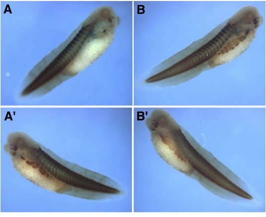 Fig. 4 (Left). Rescue of hypaxial muscle differentiation. Embryos were injected into one side with MyoS-MO (20 ng) or MyoS-MO plus MyoS mRNA (0.5 ng); the injected side was marked by lacZ RNA. Embryos were stained with 12/101 antibody and for β-galactosidase. (A) MyoS-MO, injected side (3/16 or 20% of embryos showed medium to strong staining, 13/16 weak to negative staining); (A uninjected side (16/16 strong staining). (B) MyoS- MO plus mut-MyoS mRNA, injected side (8/13 or 60% medium to strong staining, 5/13 weak to negative); (B uninjected side (13/13 strong staining).