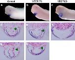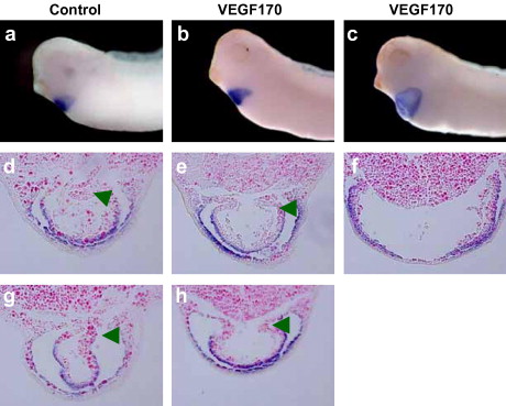Over-expression of VEGF170 inhibited the formation of heart looping. In situ hybridization to detect cardiac troponin transcripts (purple color) was completed before sectioning, and morphology was studied using eosin staining. Lateral view of embryos (a–c). Histological analysis of heart morphology in transverse sections of Xenopus embryos (d–h). Control embryos (a, d, and g) and embryos injected with VEGF170 (b, e, and h) showing severe edema (c and f). Transverse section demonstrating that heart tube looping did not form in VEGF170-injected embryos. Anterior section (d, e, and f) and posterior section (g and h) of the heart tube (green allow head shows the position of heart bending).