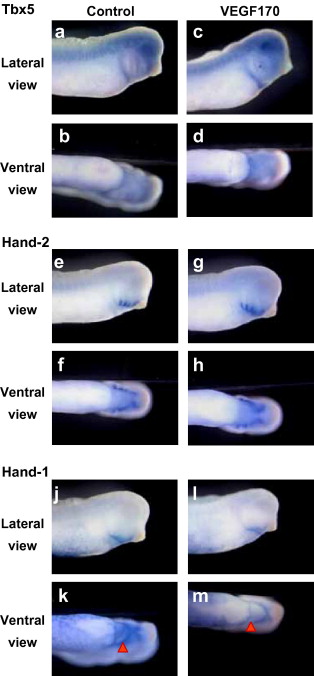 Expression of heart markers in VEGF170-injected embryos. (c, d, g, h, l, and m) Stage 35 control embryos. (a, b, e, f, j, and k) Stage 35 embryos injected with 1000 pg VEGF170 mRNA in the one vegetal dorsal region at the eight-cell stage. (a–d) Tbx5 expression. (e–h) Hand-2 expression. (j–m) Hand-1 expression. Note the absence of Hand-1 expression in the heart in VEGF170-injected embryos (red arrowhead in panels k and m).