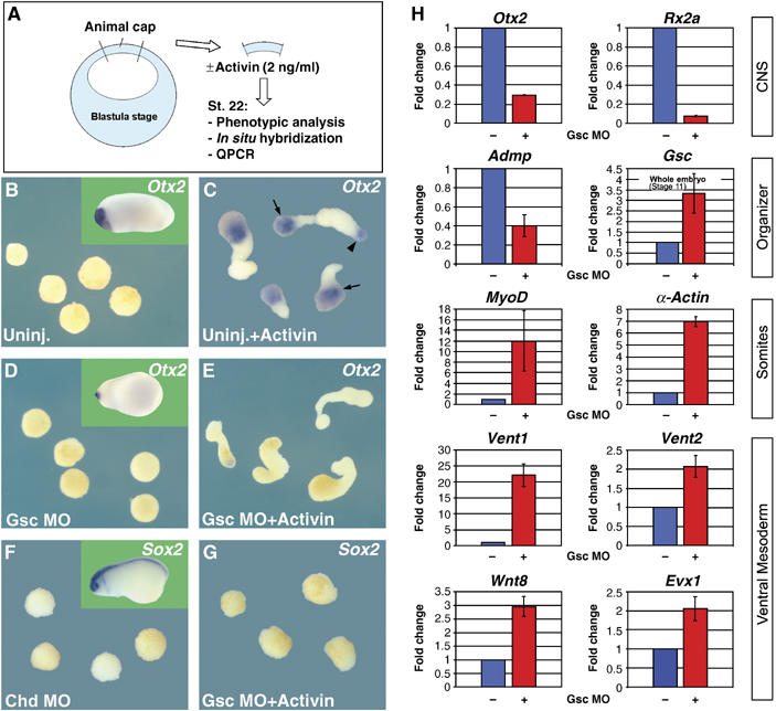 Figure 3. Gsc is required for secondary neural induction and mesoderm patterning in Activin-treated animal cap explants. (A) Experimental design (n=15 or more per experimental set) (B, C) Untreated animal caps develop into atypical epidermis, whereas Activin treatment leads to elongation and brain formation, visualized by Otx2 at the anterior pole (arrows). In addition, Otx2 expression in anterior endoderm can be seen in one of the explants (arrowhead). (D, E) Gsc-depleted caps elongate after treatment with Activin, but lack Otx2 neural staining. (F, G) Chd-depleted caps treated with Activin are unable to elongate, confirming the requirement of Chd for dorsal mesoderm and neural induction by Activin (Oelgeschläger et al, 2003). Insets show whole sibling embryos. (H) Quantitative RTâPCRs showing genes affected by depletion of Gsc include markers of anteriorCNS, organizer, somites, and ventral mesoderm. Note that Vent1 expression is increased more than 20-fold by Gsc knockdown.