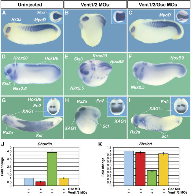 Figure 5. Gsc is required for the dorsalization caused by Vent1/2 knockdown. (A–I) Co-injection of Gsc MO restores normal pattern in Vent1/2-depleted whole embryos (n=53; Supplementary Table I). At the neurula stage, knockdown of Vent1/2/Gsc reduces the neural plate (Sox2) back to normal size (insets in panels A–C). In addition, the expansion of the cement gland and midbrain in Vent1/2 morphants is rescued in triple knockdown embyros (insets in panels G–I). Note that blood formation (Scl) is not rescued in the triple depletions (I). All MOs were injected at the same dose (45 ng each). (J) The upregulation of Chd expression by Vent1/2 MO is restored to control levels in Vent1/2/Gsc-depleted animal caps at gastrula stage. (K) Expression of Szl is downregulated by Vent1/2 MO, but restored to normal levels when Gsc is also depleted.