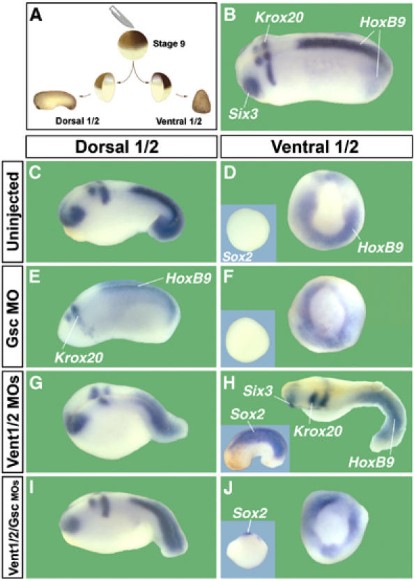 Figure 6. Knockdown of Gsc and Vent1/2 restores normal development of dorsal and ventral half-embryos (n=52 or more per experimental set). (A) Embryos were bisected into dorsal and ventral halves at blastula stage. (B) Control sibling at the same magnification as the other panels. (C, D) Bisectioned control embryos form smaller but well-proportioned dorsal half-embryos, whereas ventral halves differentiate into belly-pieces that express HoxB9 in the ventral mesoderm (Wright et al, 1990) but are devoid of neural tissue, as indicated by the lack of Sox2 expression (inset). (E, F) Gsc depletion (136 ng MO) causes a reduction of the head in dorsal halves, whereas ventral halves are not affected. (G, H) Dorsal halves of Vent1- and Vent2-depleted embryos (45 ng each) are dorsalized, but retain overall DV patterning. The corresponding ventral halves are strongly dorsalized, including expression of spinal cord (HoxB9), brain (Krox20, Six3), and pan-neural Sox2 marker (inset). (I, J) Remarkably, both halves of triple knockdown embryos (45 ng each) develop as the uninjected control half-embryos.