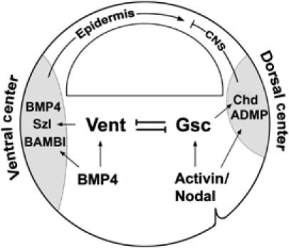 Figure 7. Model of regulatory mechanisms for pattern formation at gastrula. In the dorsal center, Activin/Nodal signals phosphorylate Smad2/3 to activate Gsc expression. The expansion of Chd and ADMP can also be achieved by Gsc-independent pathways. In the ventral center, BMP4/7 signals phosphorylate Smad1/5/8 and lead to the expression of Vent1/2. BMP4 is also able to activate ventral center secreted proteins by Vent-independent mechanisms. The function of Gsc and Vent is to regulate each other, providing an intracellular compensatory mechanism that works in concert with the extracellular networks of growth factors and their antagonists.